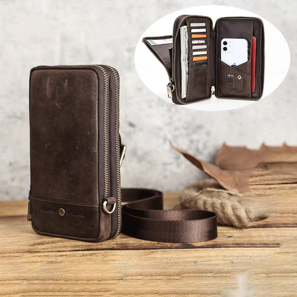 Handmade Crazy Horse Leather Zipper Chest Bag for Men, Vintage Leather Crossbody Bag for Men
