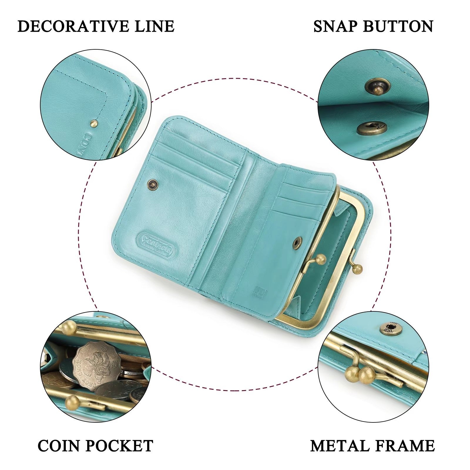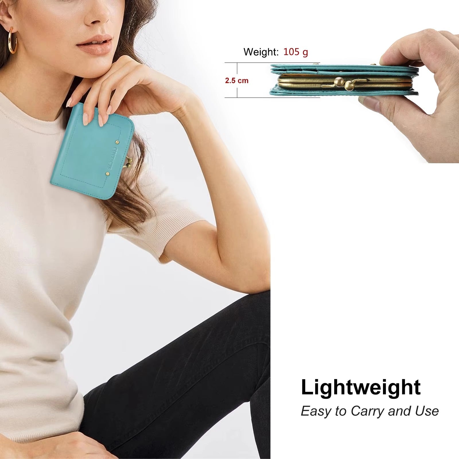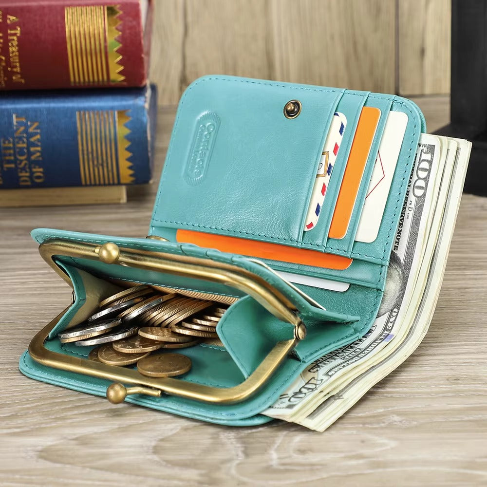 Women Leather Bifold Clutch Wallet with Metal Frame