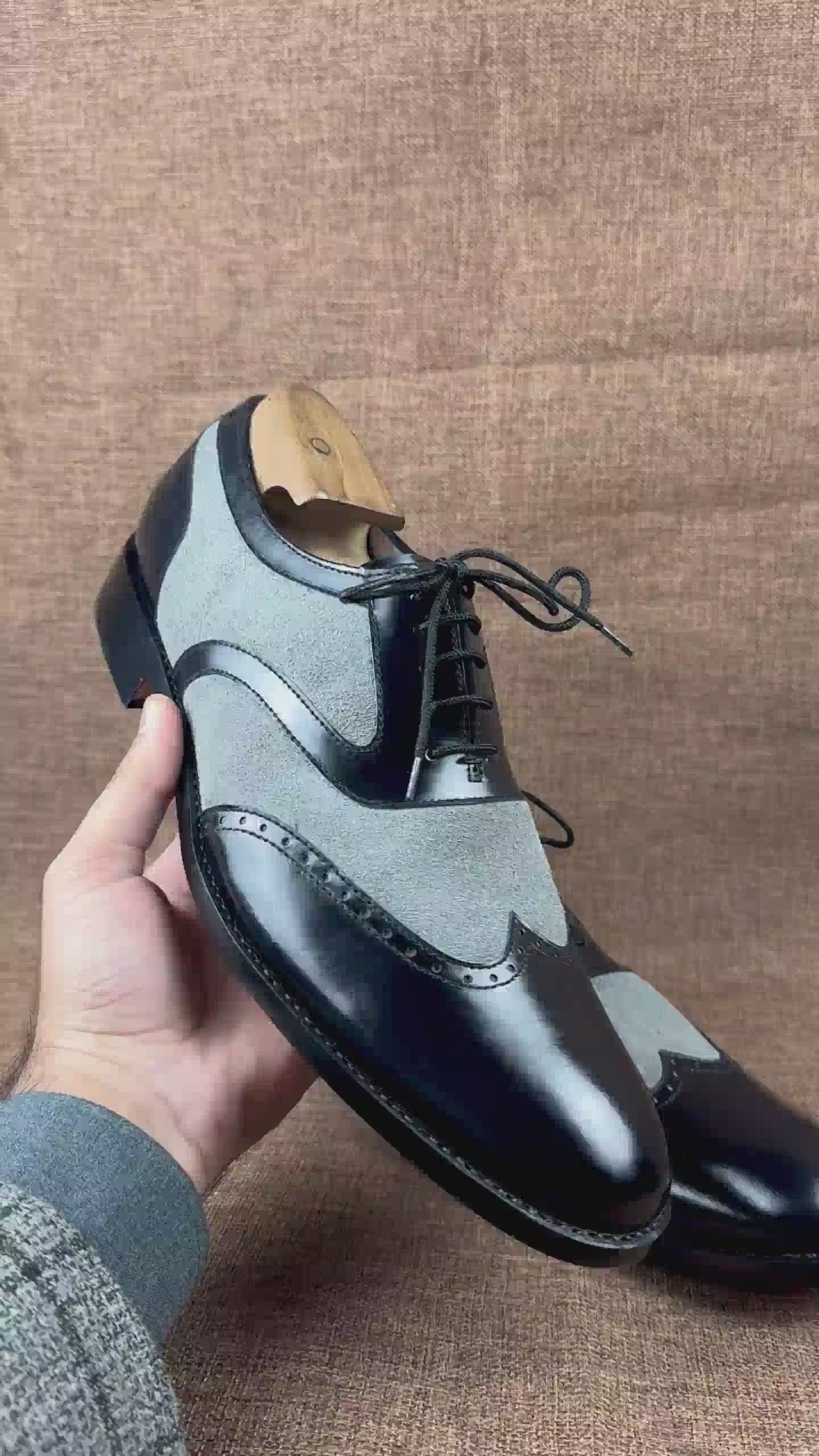 Men's Black and Gray Wingtip Brogue Tuxedo Dress Shoes