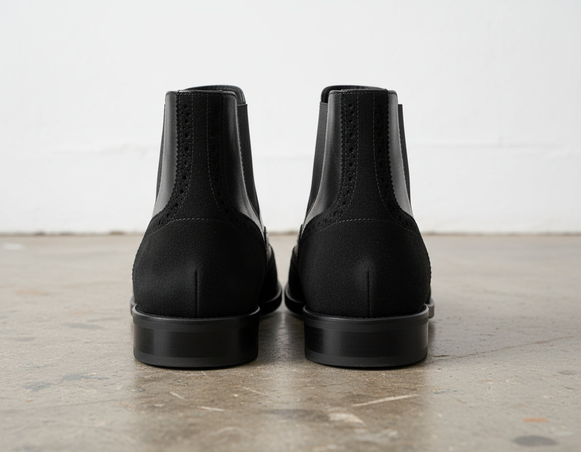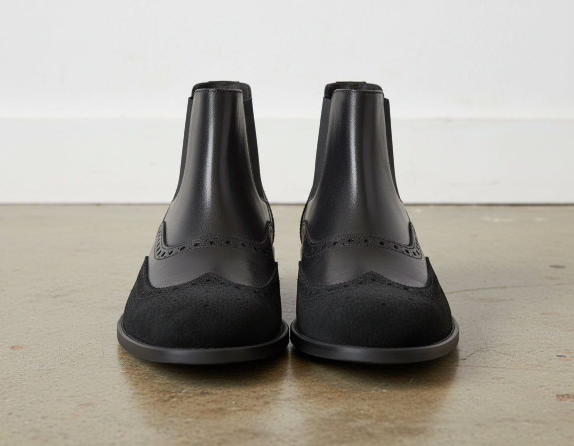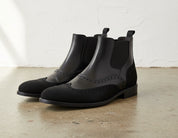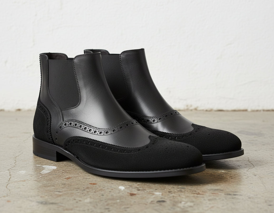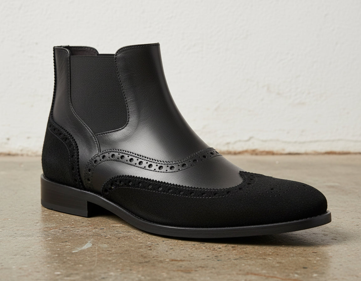 Handcrafted Men's Black Leather Chelsea Boots with Wingtip Brogue Detailing