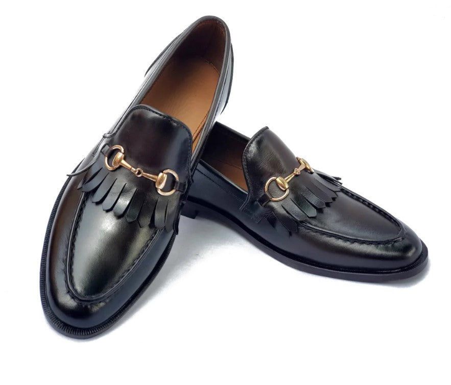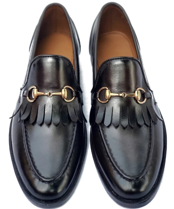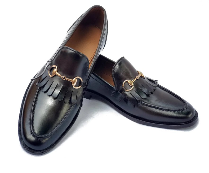 Handcrafted Black Leather Fringe Loafer Moccasins for Men