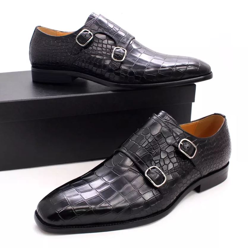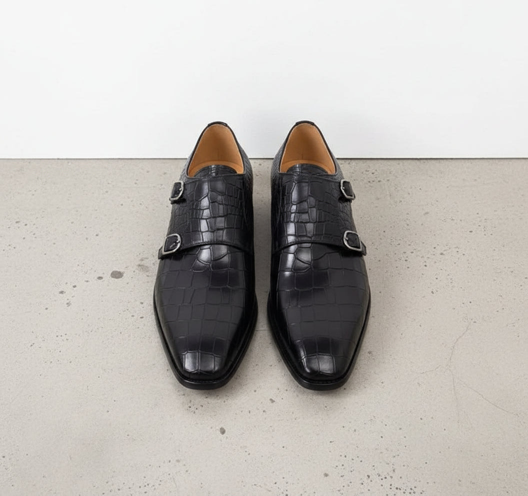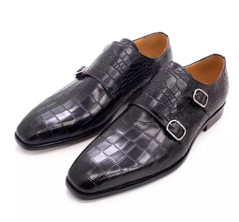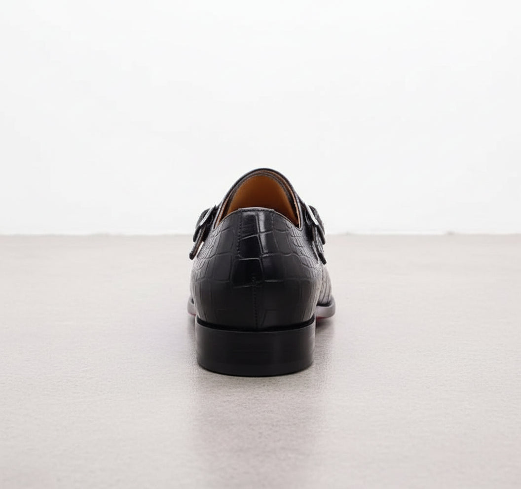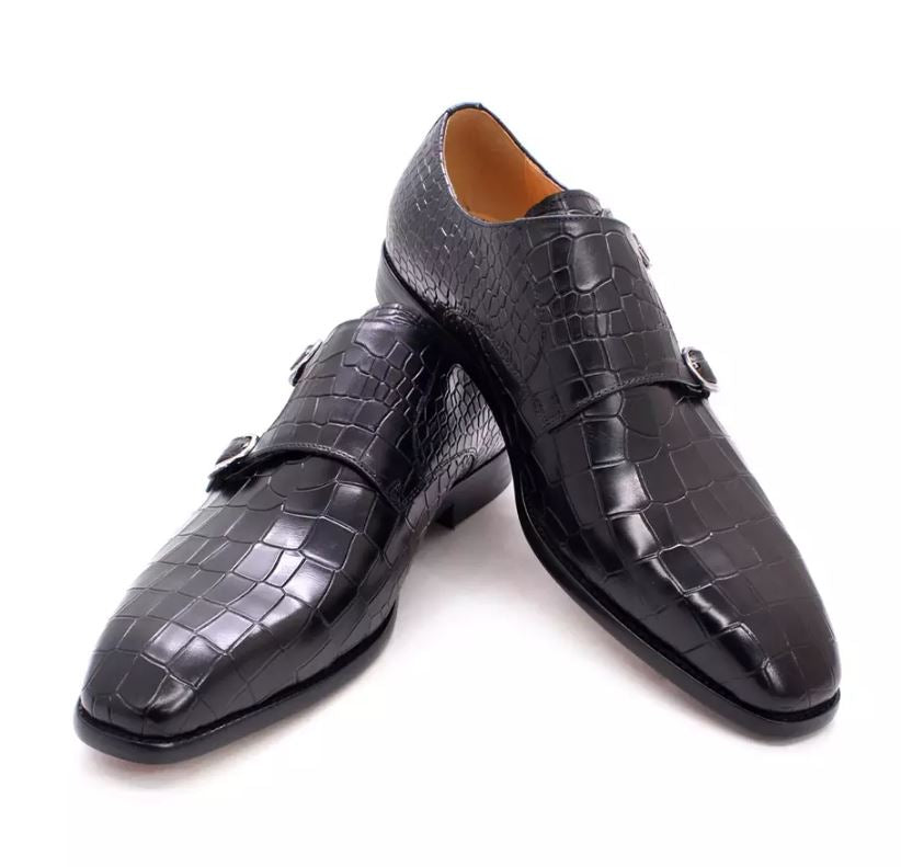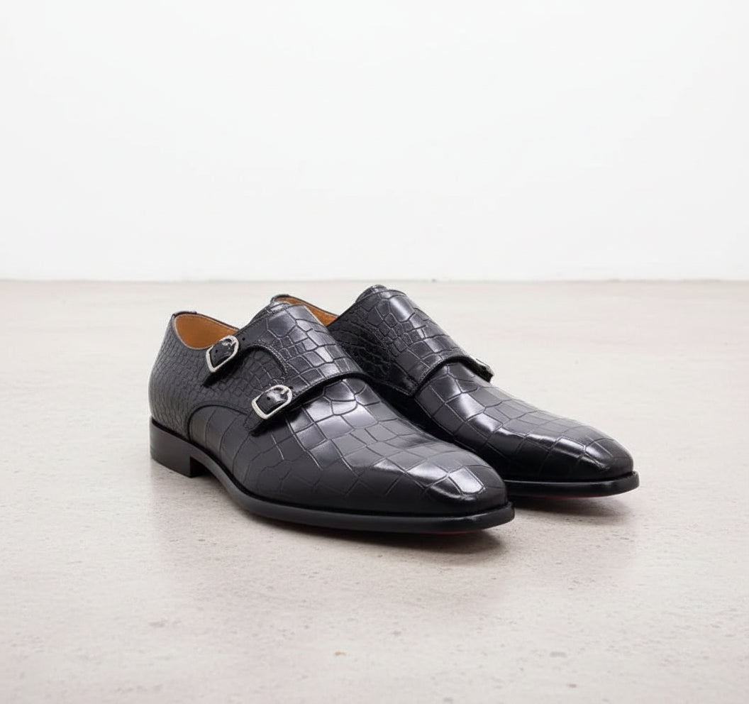 Handcrafted Black Monk Shoes with Crocodile Pattern