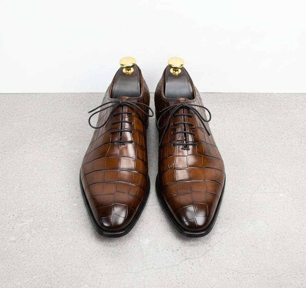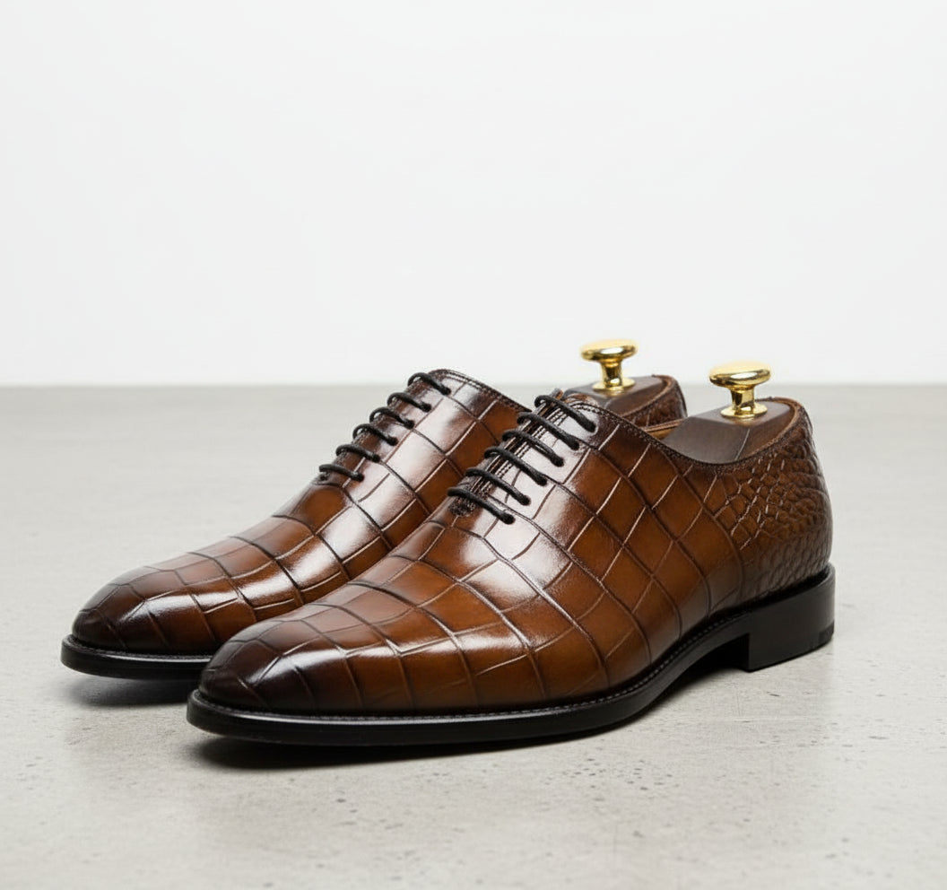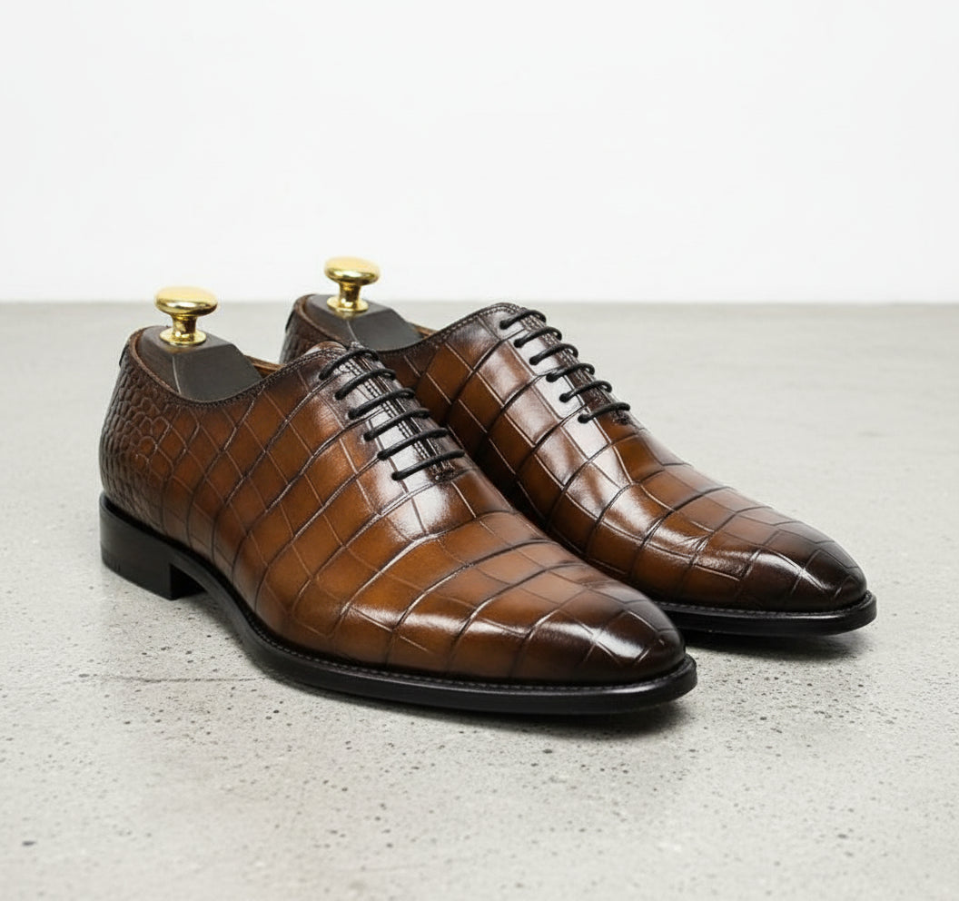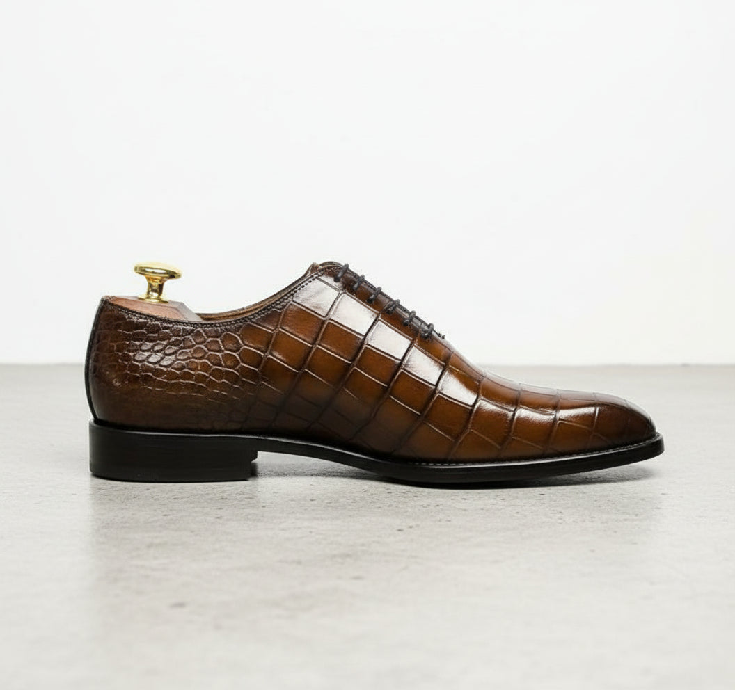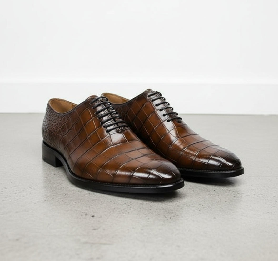 Handcrafted Men's Brown Crocodile-textured Formal Dress Shoes