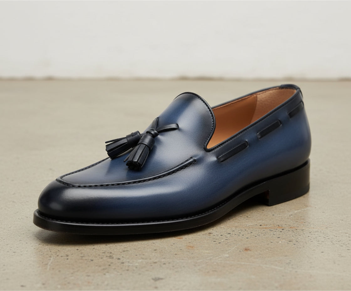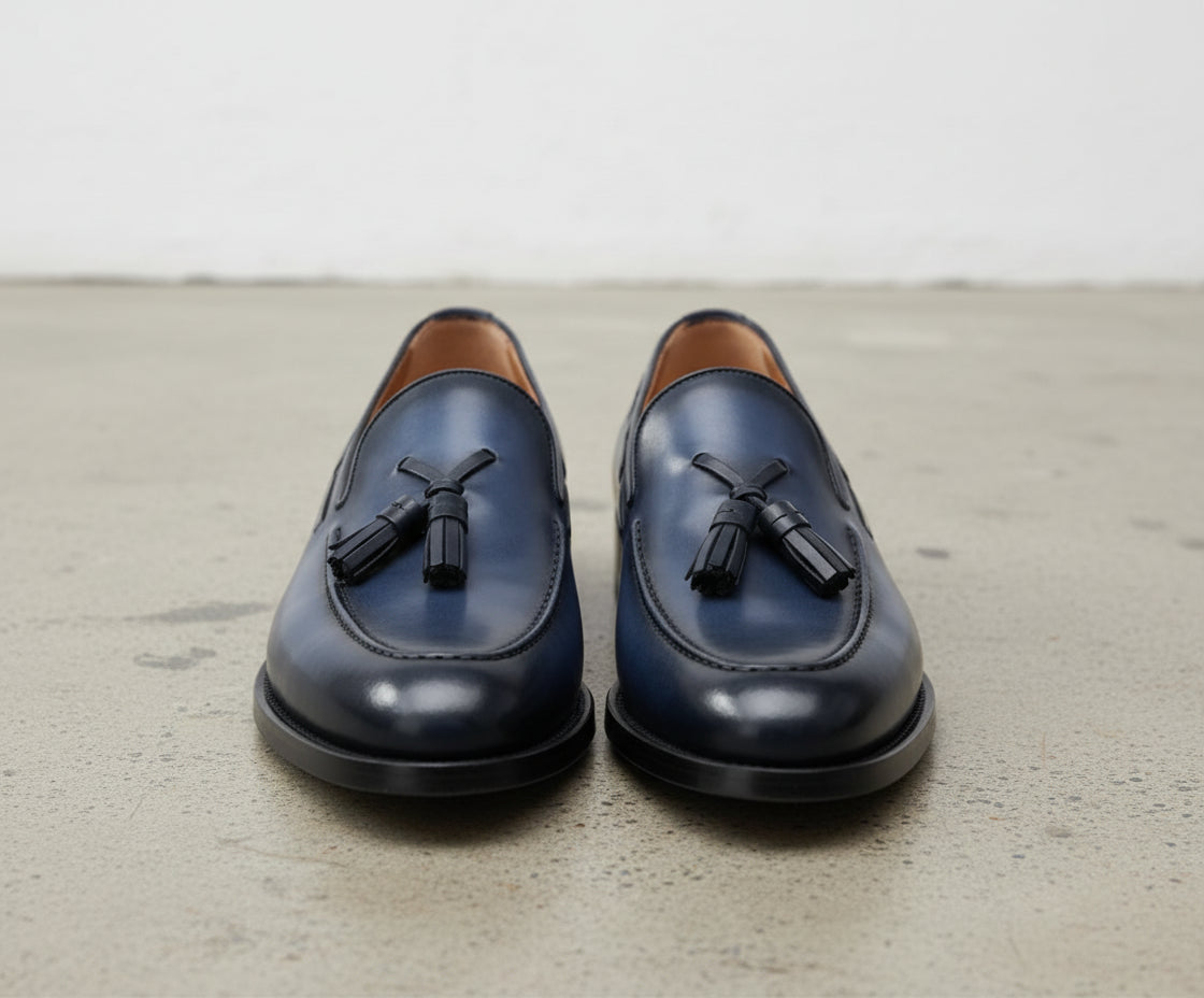 Men Navy Blue Leather Dress Shoes, Men Leather Formal Shoe Tassel Moccasins