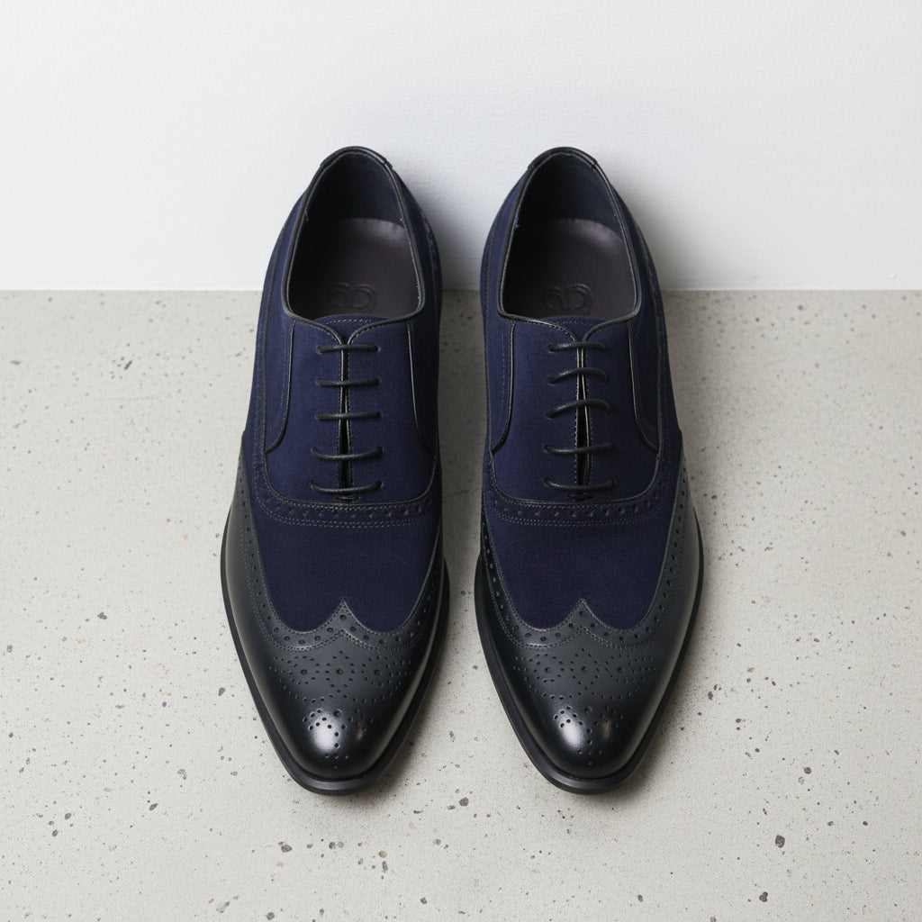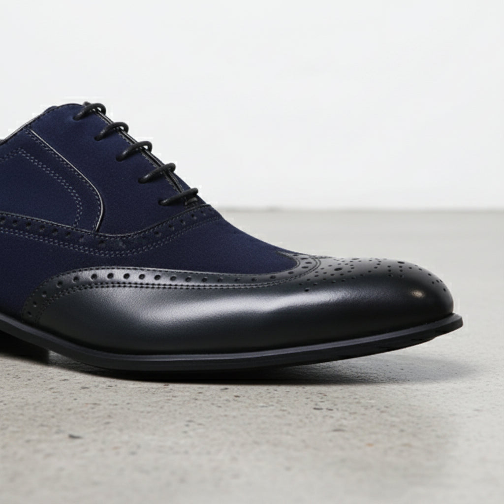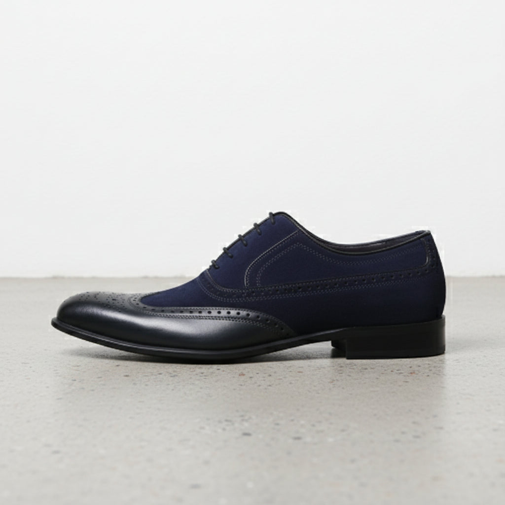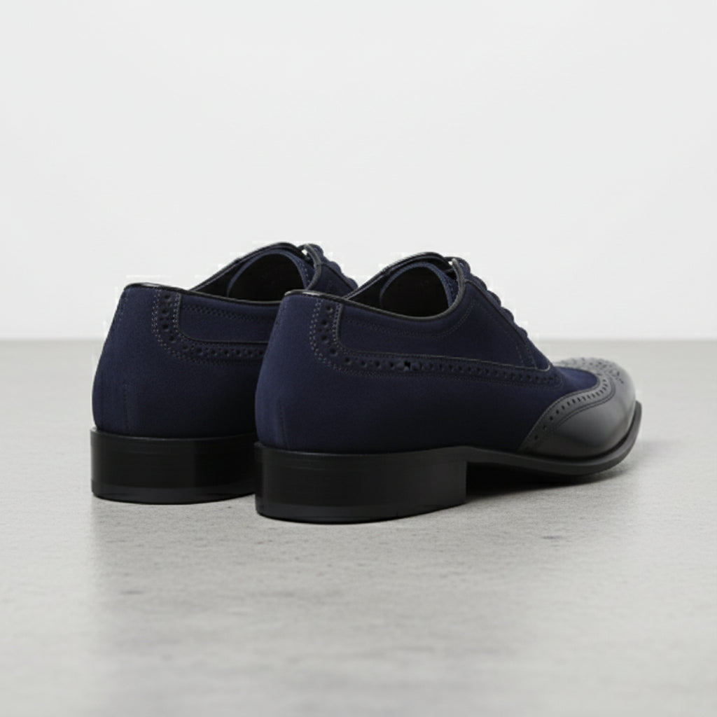 Handcrafted Men's Two-tone Wingtip Dress Shoes in Black and Blue Suede