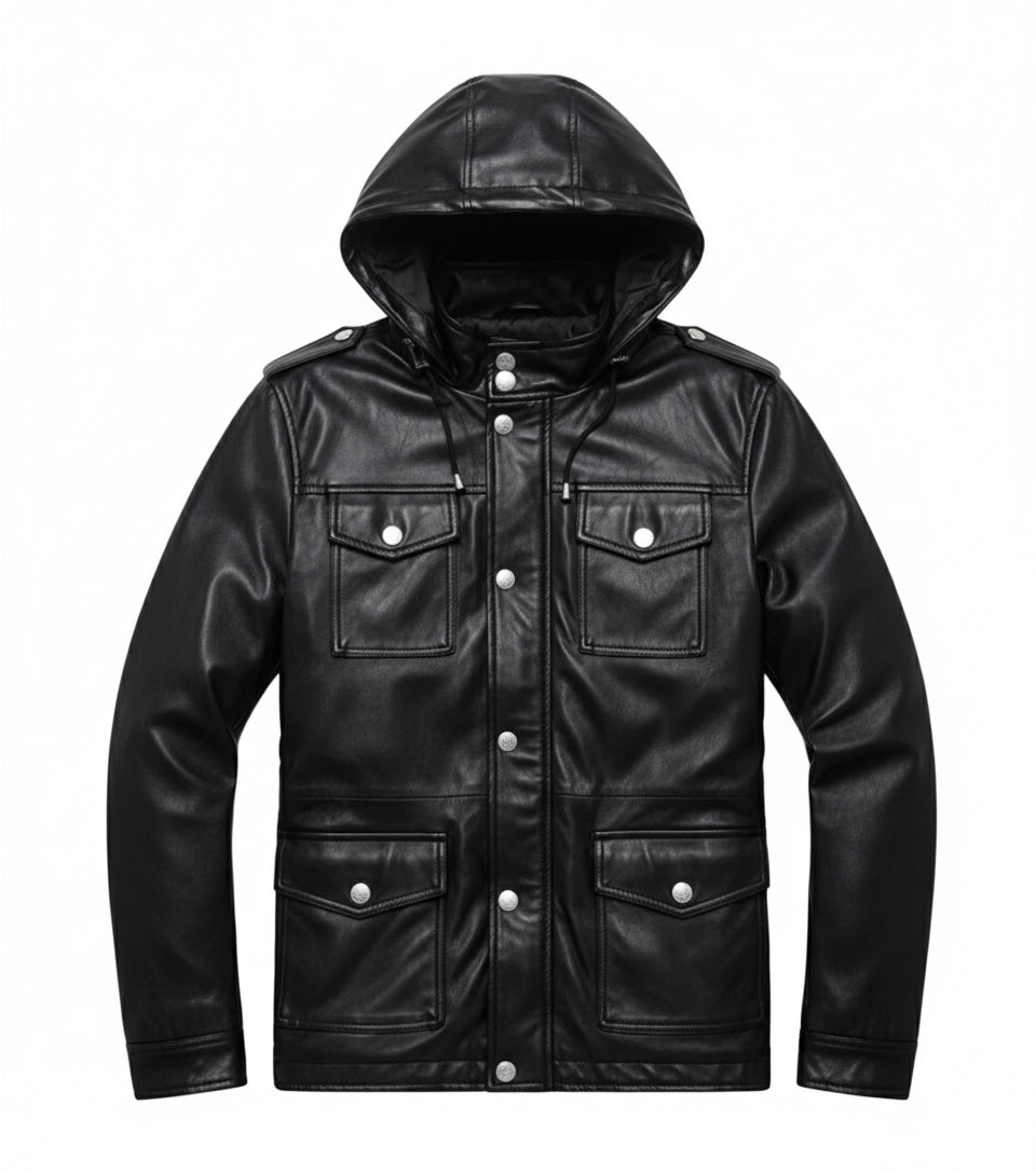 Handmade Mens Black Biker Hooded Leather Jacket, Black Sheep Leather Jacket