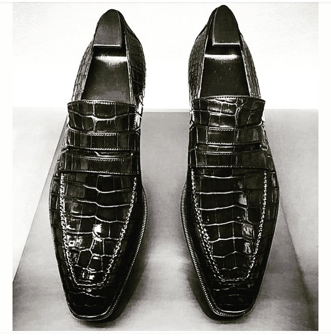 Handmade Mens Black Crocodile Embossed Leather Shoes Moccasins