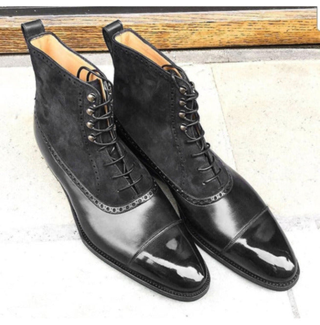Handcrafted Men's Black Lace-Up Dress Boots in Genuine Leather & Suede