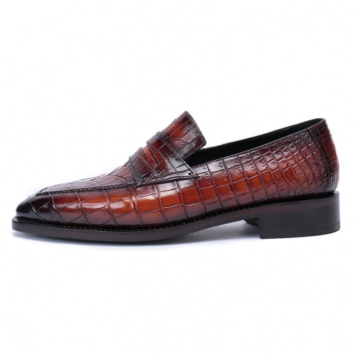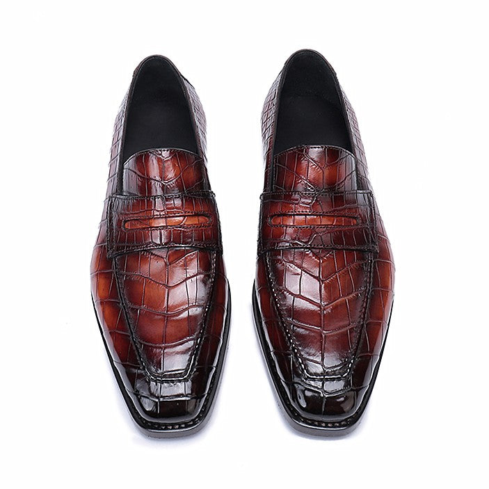 Handcrafted Men's Burgundy Loafer Moccasins with Alligator Embossed Print