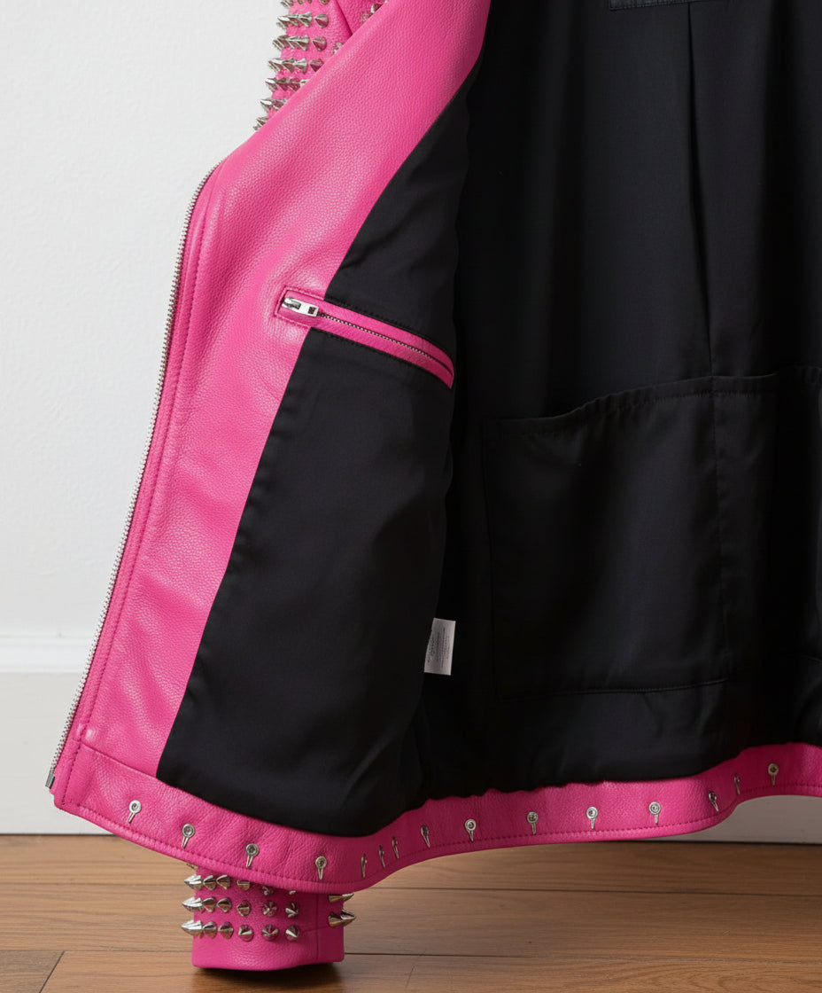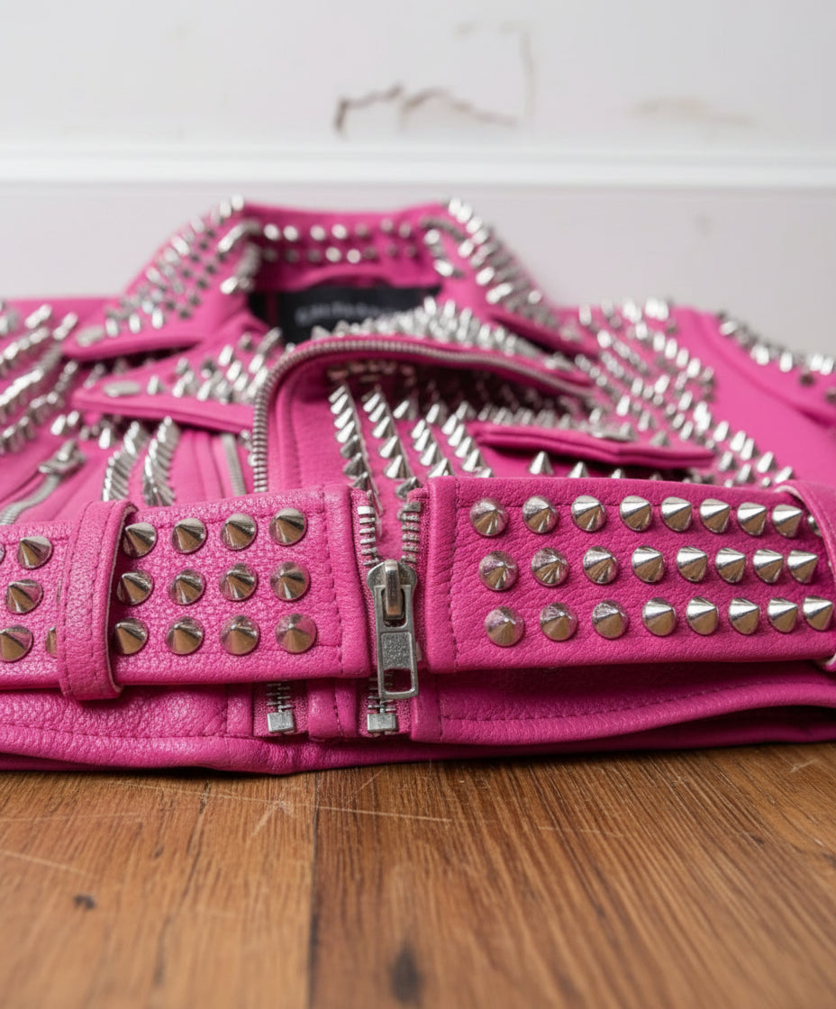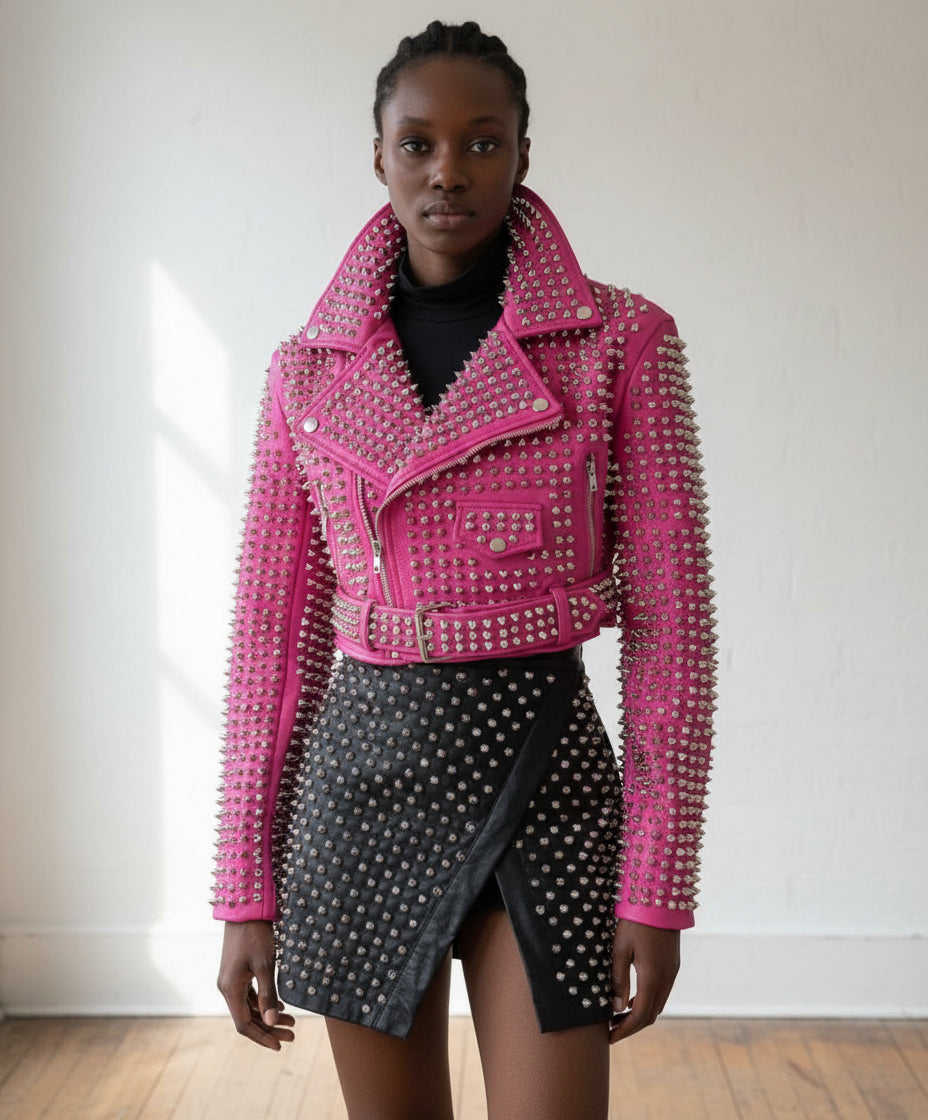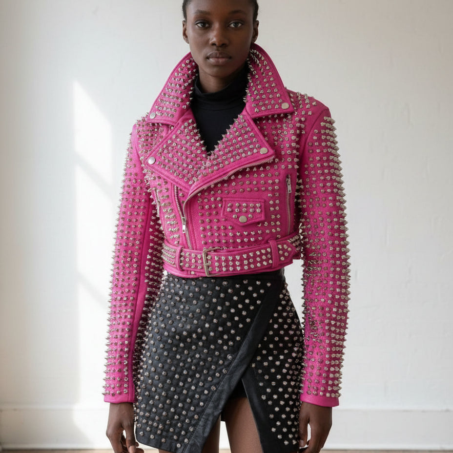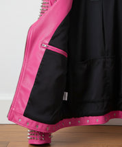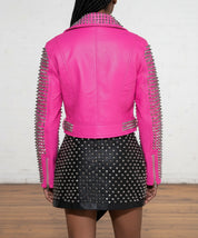 Women's Handmade Hot Pink Studded Leather Moto Jacket
