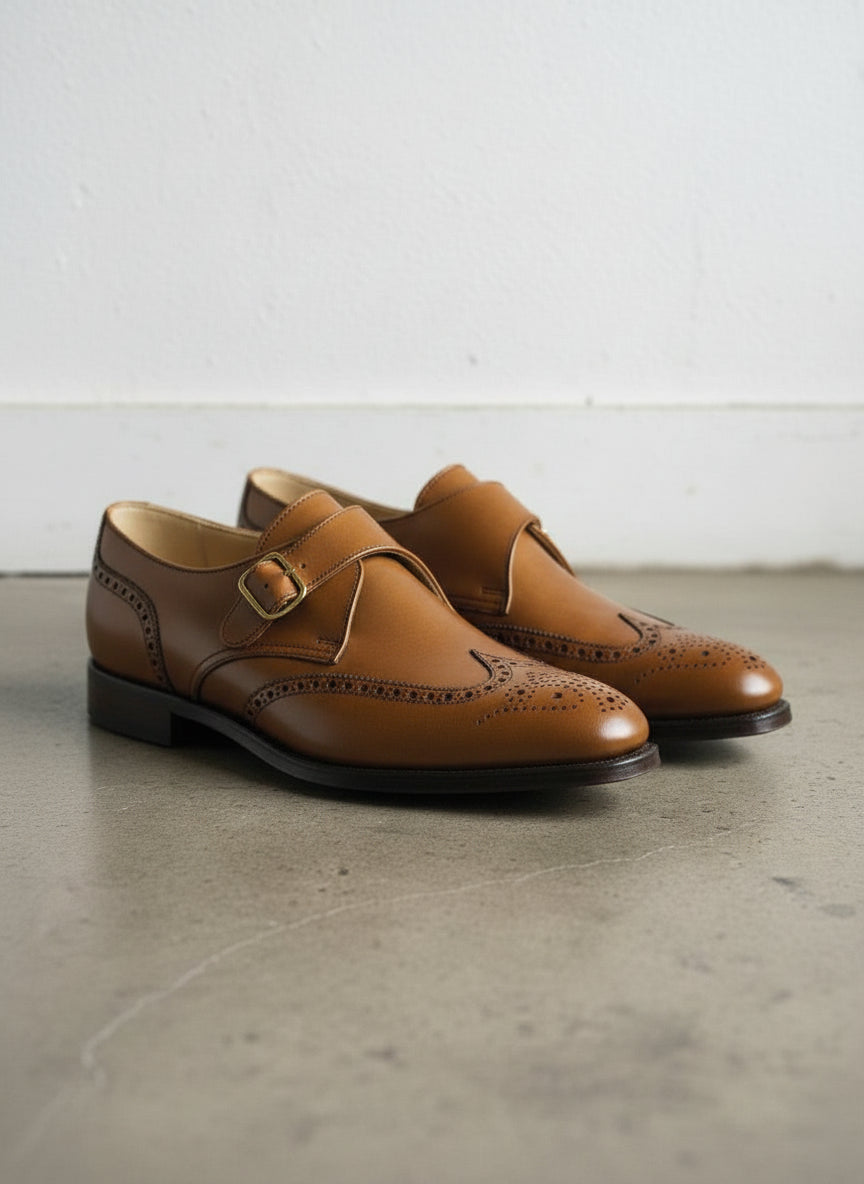 Handmade Men's Tan Brown Leather Wing Tip Monk Dress Shoes