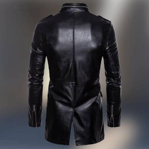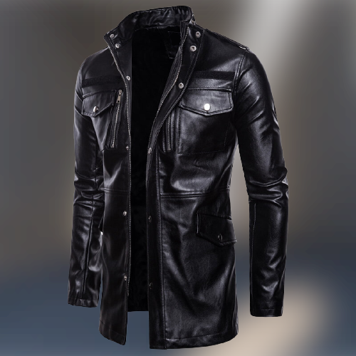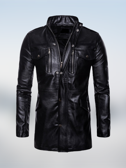 Men's Handmade Black Leather Long Jacket with Multi Pockets