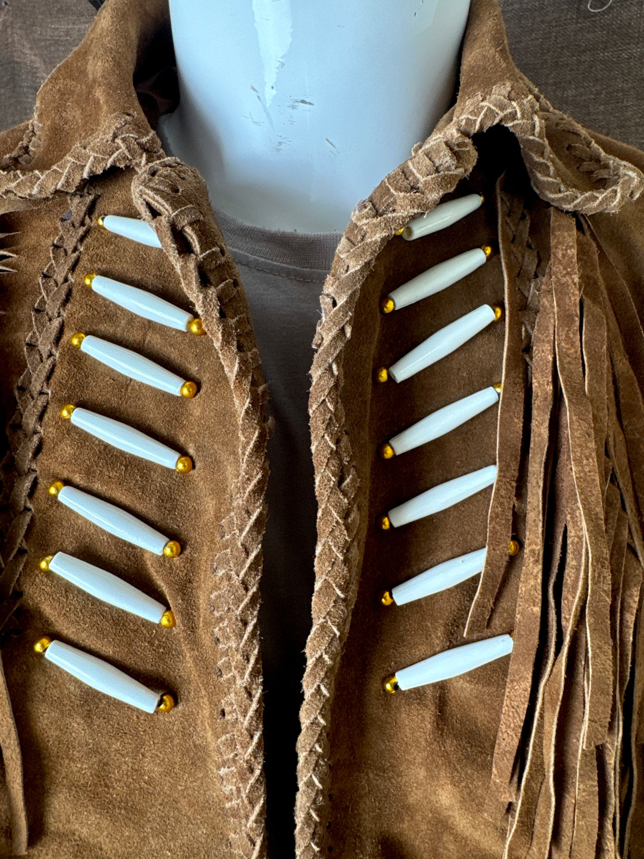 Men's Handmade Brown Suede Western Jacket with Fringes and Beadwork