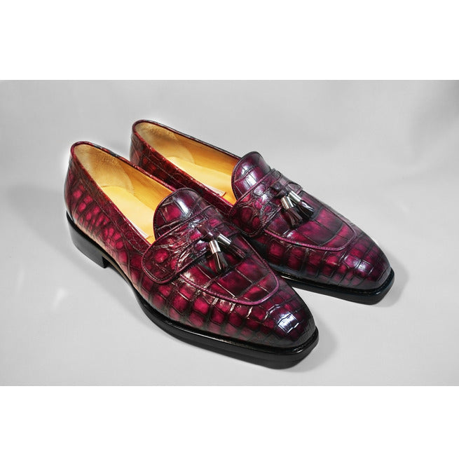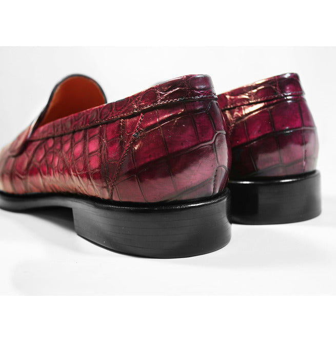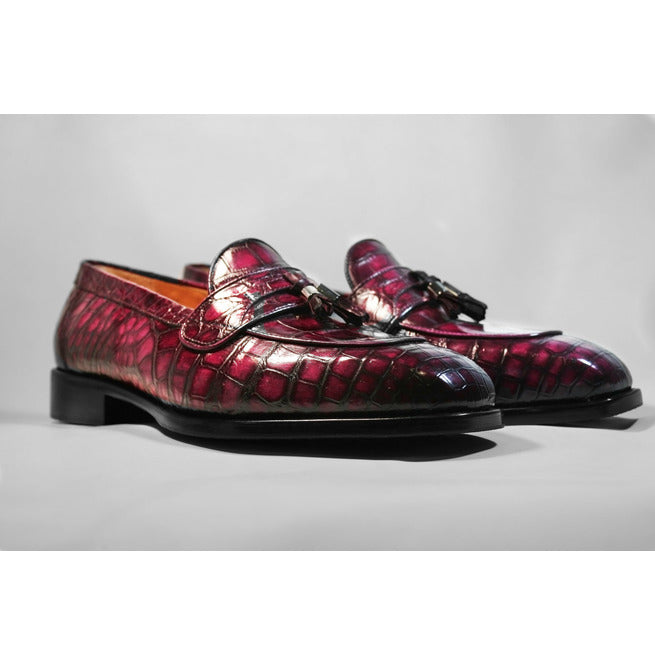 Handmade Men's Burgundy Crocodile Textured Leather Loafers