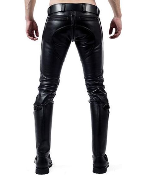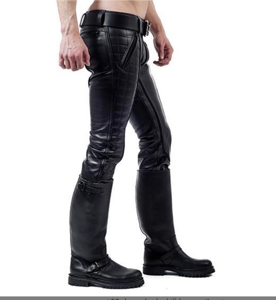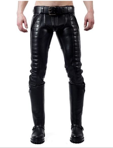 Punk Men Style Black Pant Cow Leather Quilted Jeans Rock Fashion Pant