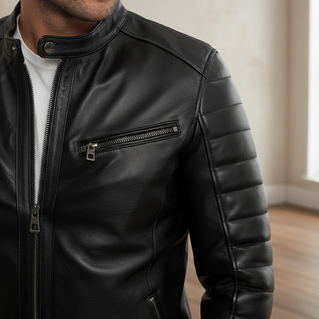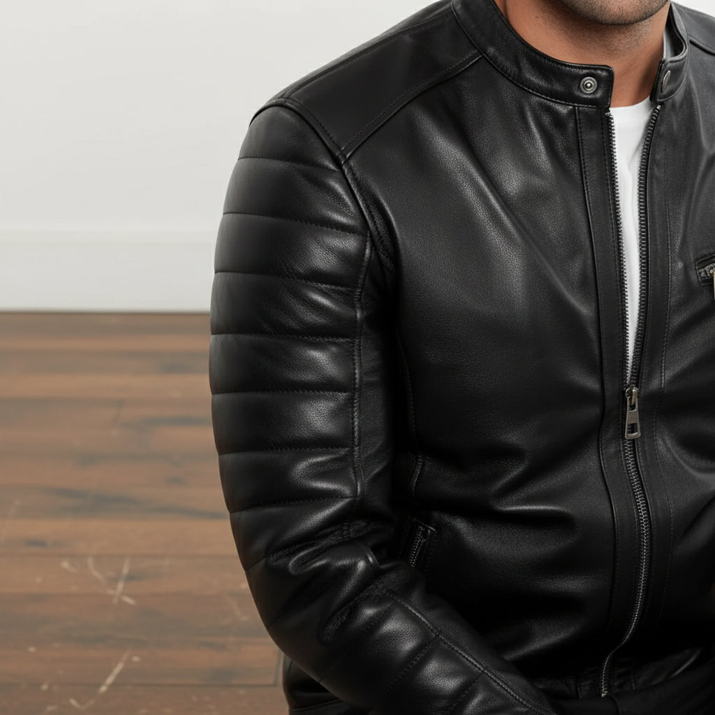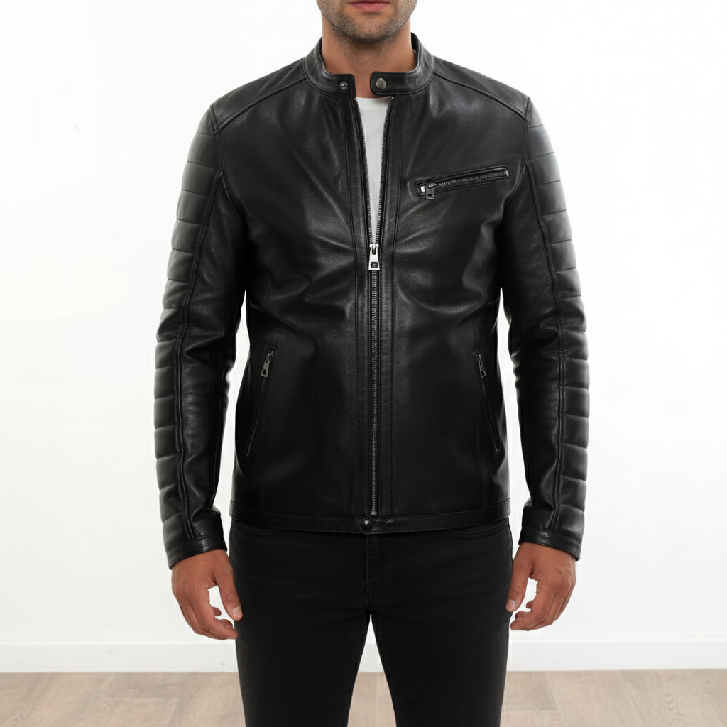 Men’s Quilted Sleeve Biker Jacket- Genuine Leather Moto Jacket