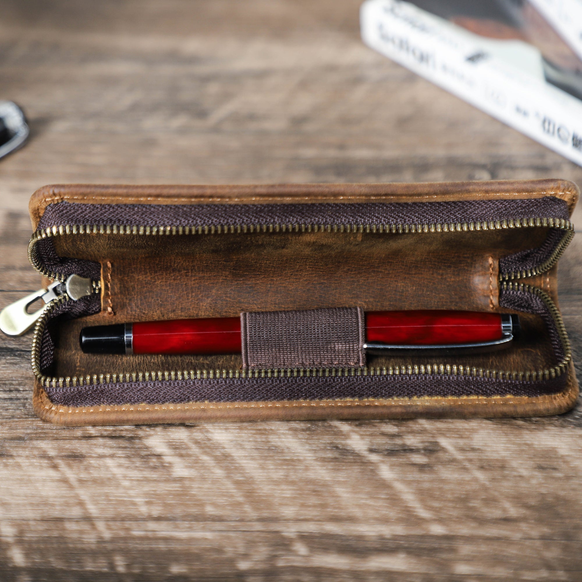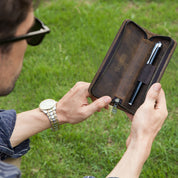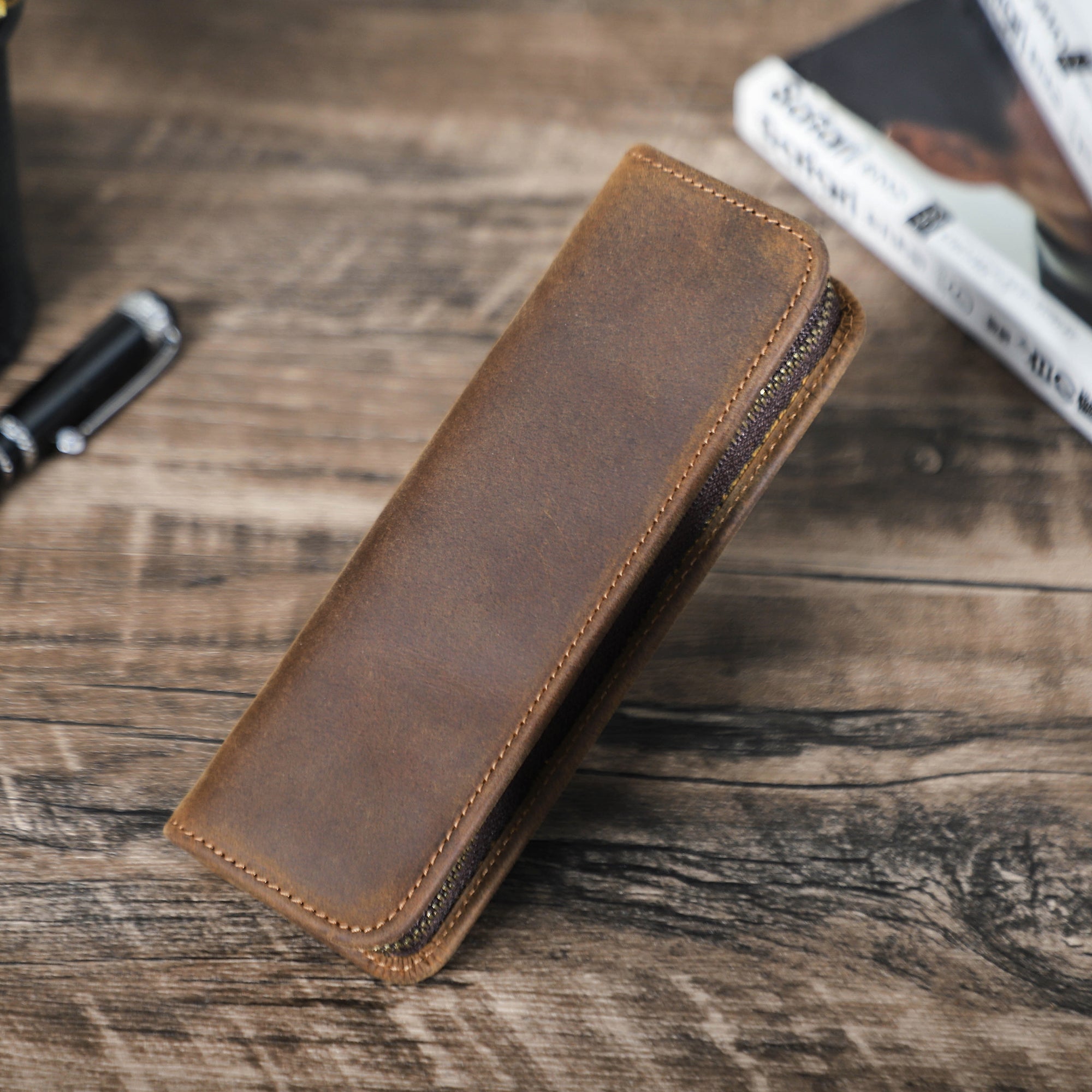 Genuine Leather Pen Case with Zipper Closure